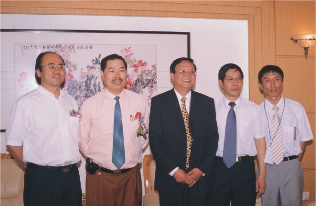 杨奕勇(左二)与主讲嘉宾中国城市商业网点建设管理联合会会长 荀培路(左三)、北京大学理论经济学博士后王学东(左一)、沈阳 商业局副局长李四文(右二)及大会秘书长于群(右一)合影